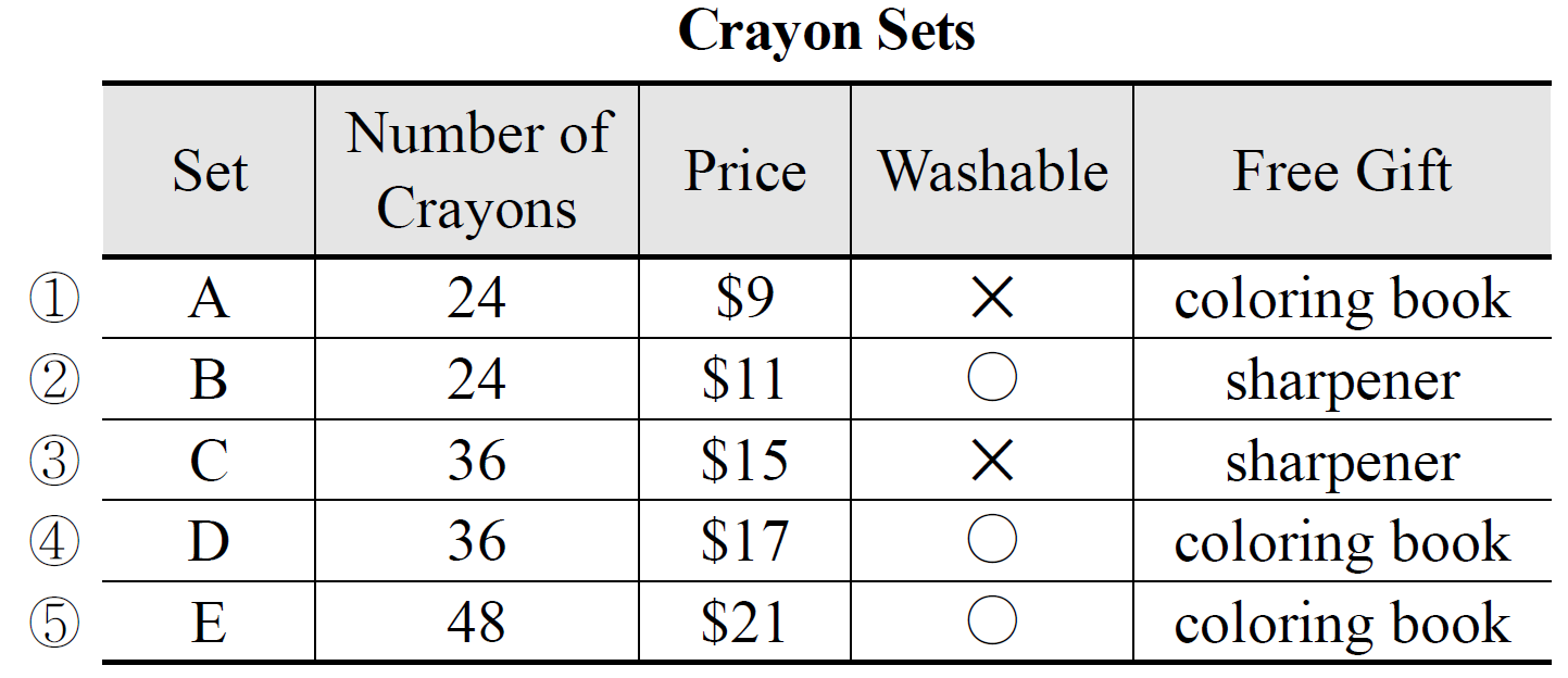 10. 다음 표를 보면서 대화를 듣고, 두 사람이 주문할 크레용 세트를 고르시오.