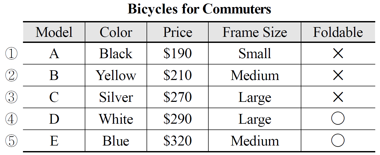 10. 다음 표를 보면서 대화를 듣고, 남자가 주문할 자전거를 고르시오.