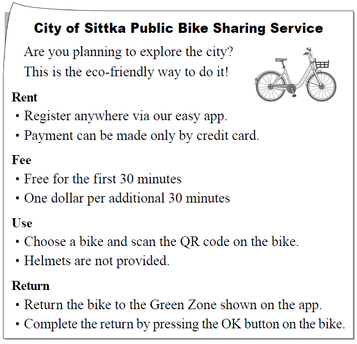 2. City of Sittka Public Bike Sharing Service에 관한 다음 안내문의 내용과 일치하지