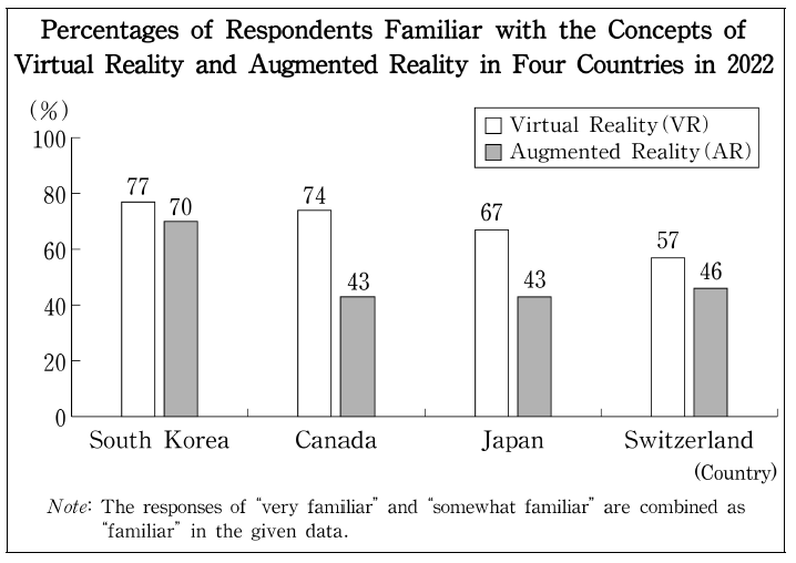 The graph above shows the percentages of respondents who were familiar with the concept of virtual reality (VR) and those who were familiar with the concept of augmented reality (AR) in four countries in 2022. ① For each country, the percentage of respondents familiar with VR was greater than the percentage of respondents familiar with AR. ② The country with the highest percentage of respondents familiar with AR was South Korea. ③ The country with the largest gap between the percentage of respondents familiar with VR and that of respondents familiar with AR was Canada. ④ In Japan, the percentage of respondents familiar with VR was greater than 60%. ⑤ The percentage of respondents familiar with VR and that of respondents familiar with AR were lower in Switzerland than in Japan, respectively.